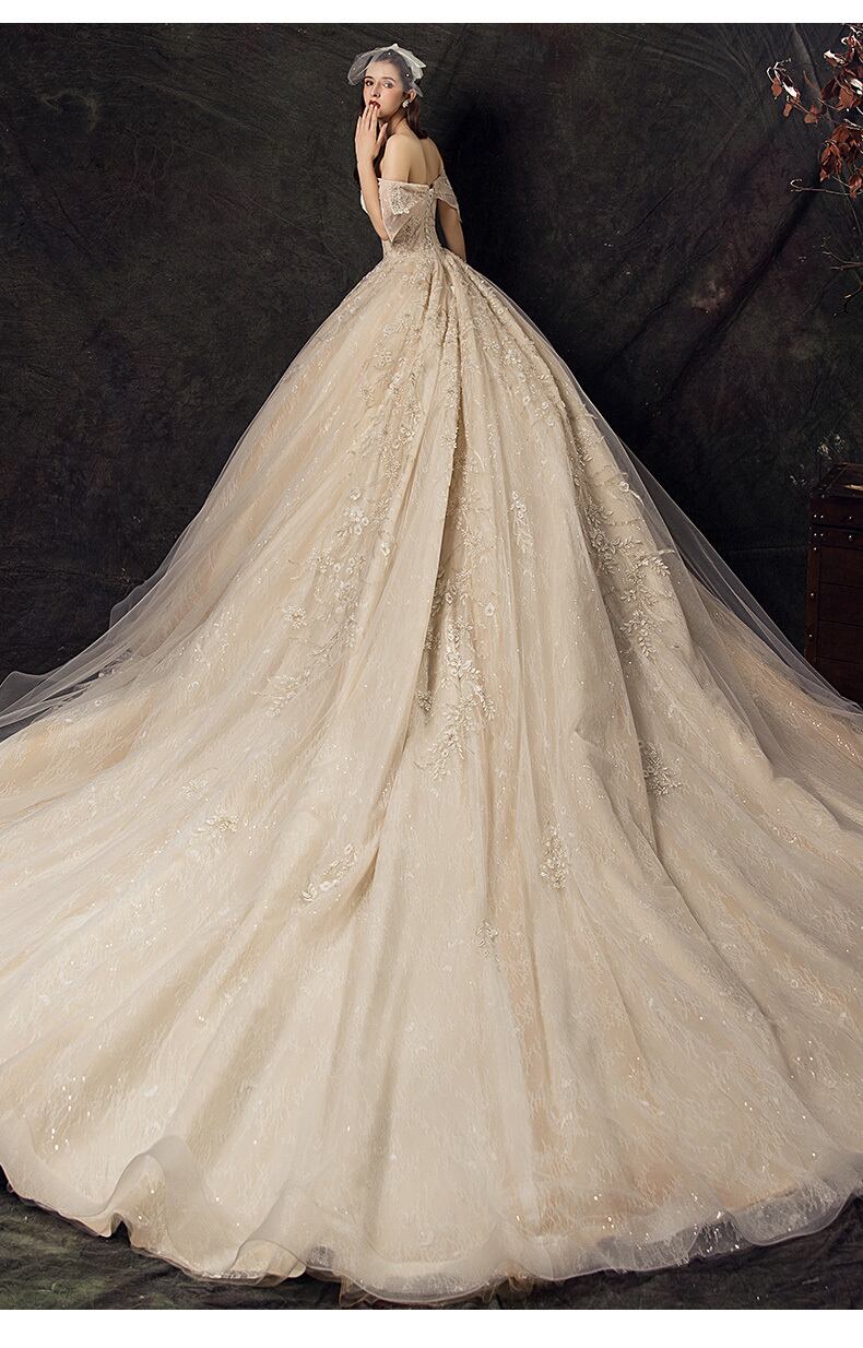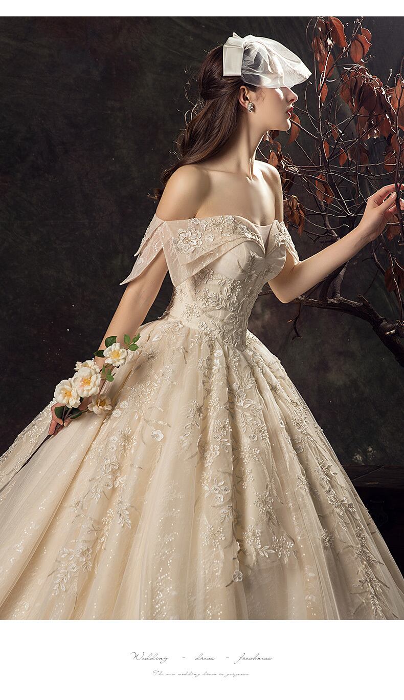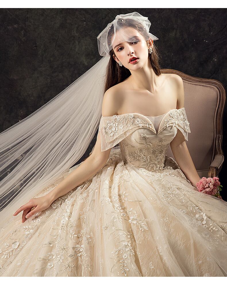 ウエディングドレス オフショルダー シャンパン色 プリンセスライン トレーン/ロング(ご指定自由) レース クラシカル