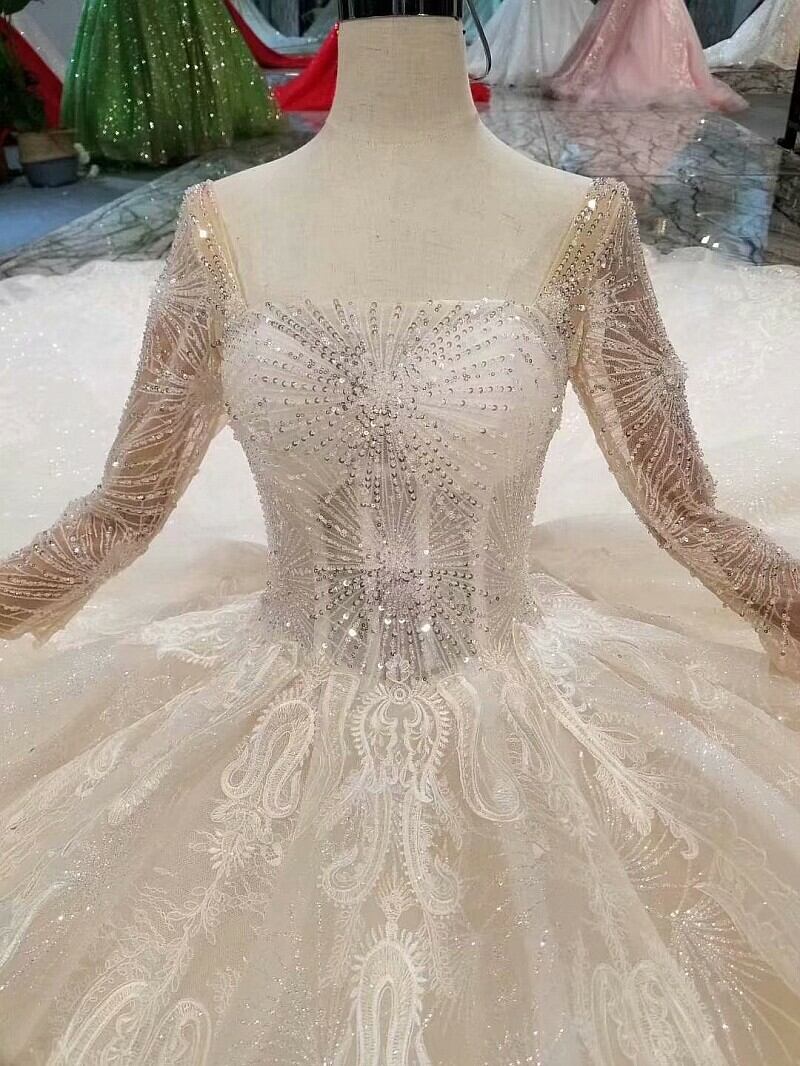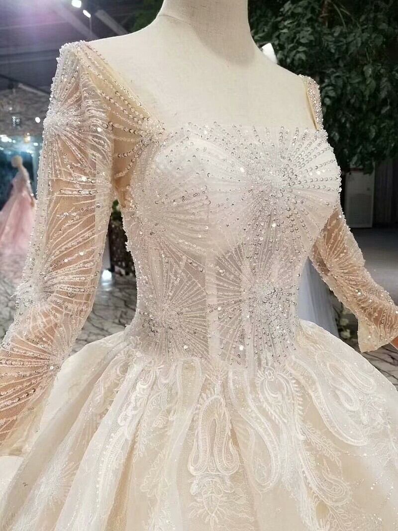 ウエディングドレス スパンコール 光沢サテン オフショルダー プリンセスライン 長袖 エレガント タンクトップ
