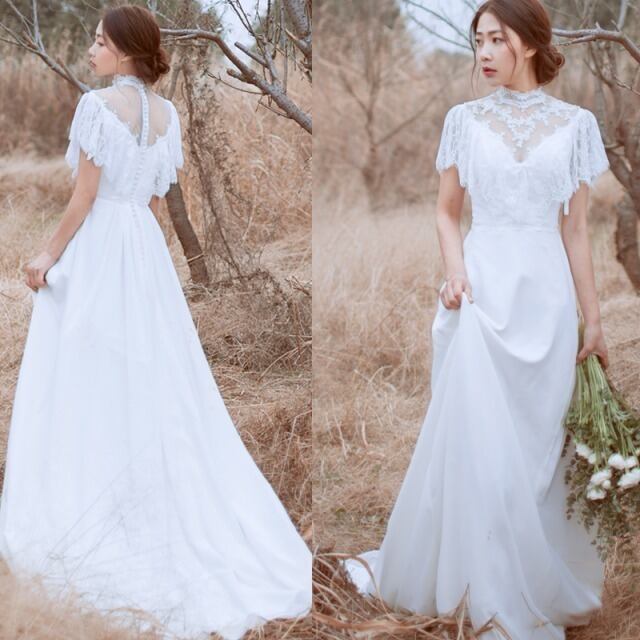 ウエディングドレス レース Aライン 短袖 優雅なシルエット 花嫁/ウェディングドレス ロングドレス