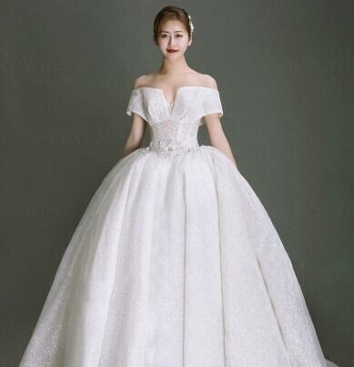 ウエディングドレス ホワイト ソフトチュール オフショルダー ソフトチュール エレガント 編み上げ 細見えシルエット 高品質!