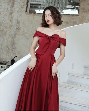 高品質! イブニングドレス ワインレッド オフショルダー ロング 人気上昇 エレガント 優雅なシルエット 細見えシルエット