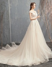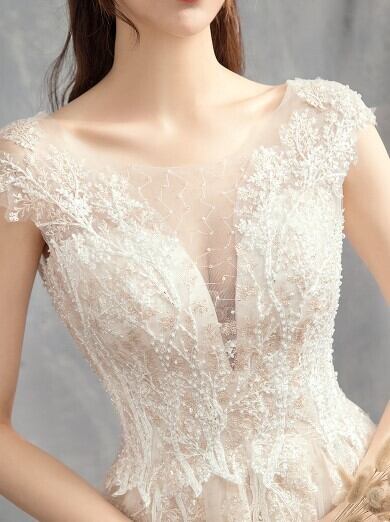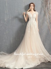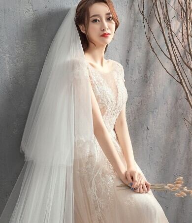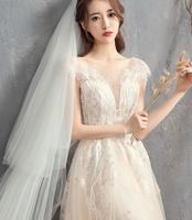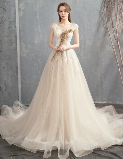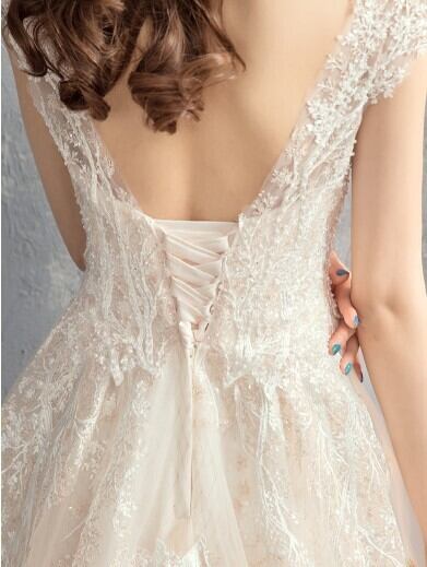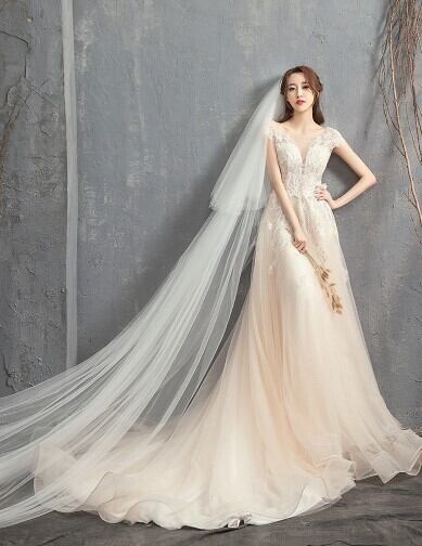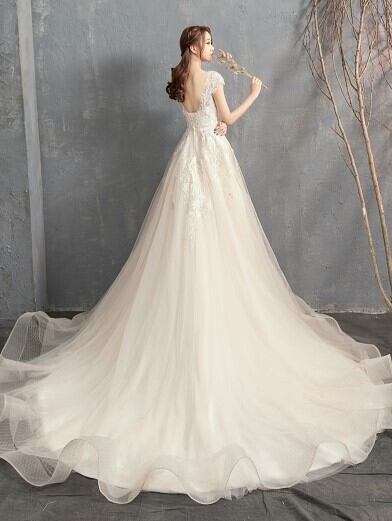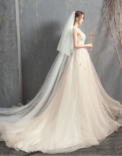 高品質! ウエディングドレス ソフトチュール ロングトレーン エレガント 編み上げ 細見えシルエット
