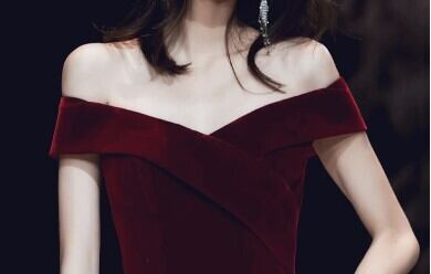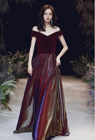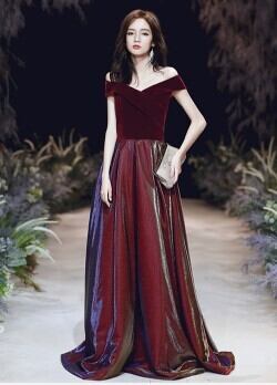 美品! イブニングドレス ワインレッド オフショルダー 優雅なシルエット 細見えシルエット
