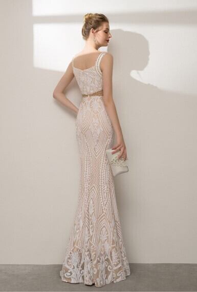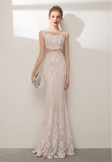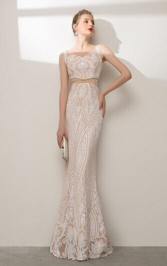 高品質! イブニングドレス シャンパン色 マーメイドライン 優雅なシルエット 細見えシルエット