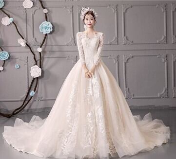 美品! ウエディングドレス 薄シャンパンの色 ロングトレーン 花嫁/ウェディングドレス/ブライズメイド/結婚式/披露宴/