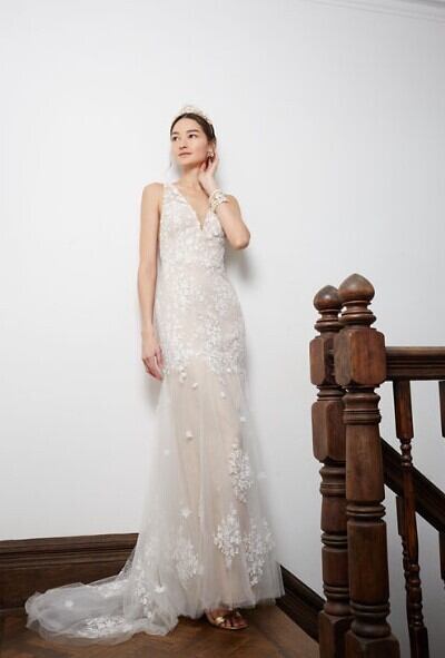 高品質! ウエディングドレス ミニトレーン/短トレーン 繊細レース 深Vネック マーメイドライン 細見えシルエット