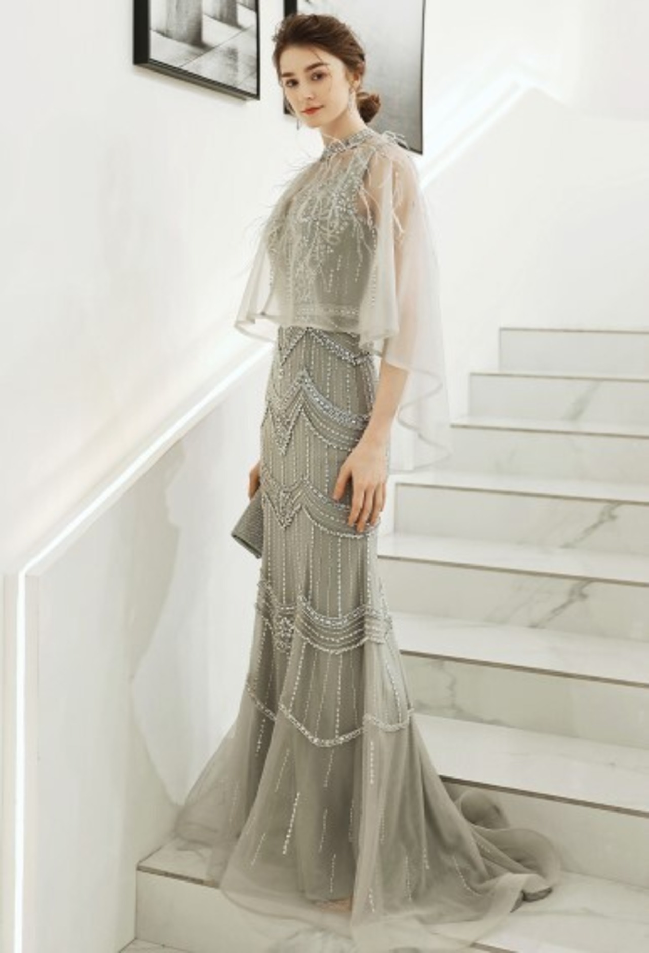 華やか イブニングドレス グレー マーメイドライン 優雅なシルエット Vネック エレガント 細見えシルエット