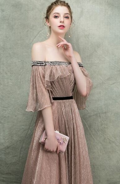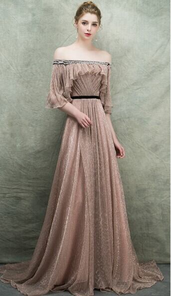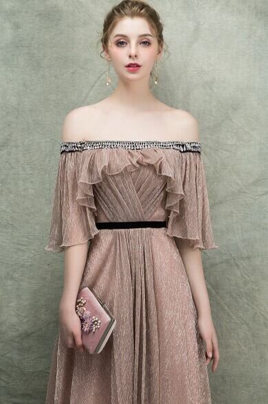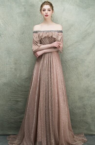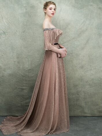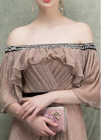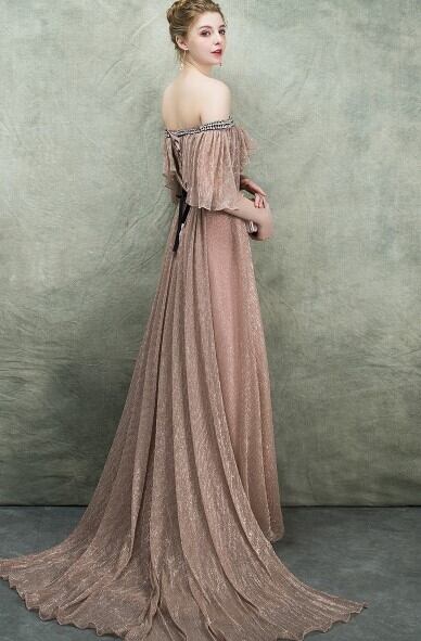 上品! イブニングドレス オフショルダー ミニトレーン/短トレーン エレガント 編み上げ 細見えシルエット