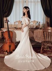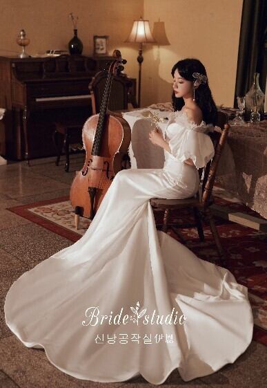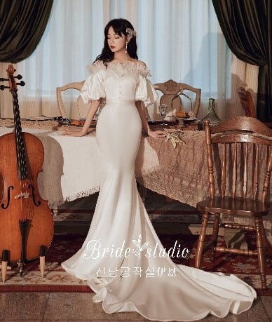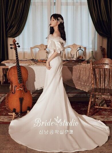 エレガント ウエディングドレス アイボリー オフショルダー マーメイドライン 光沢サテン 細見えシルエット