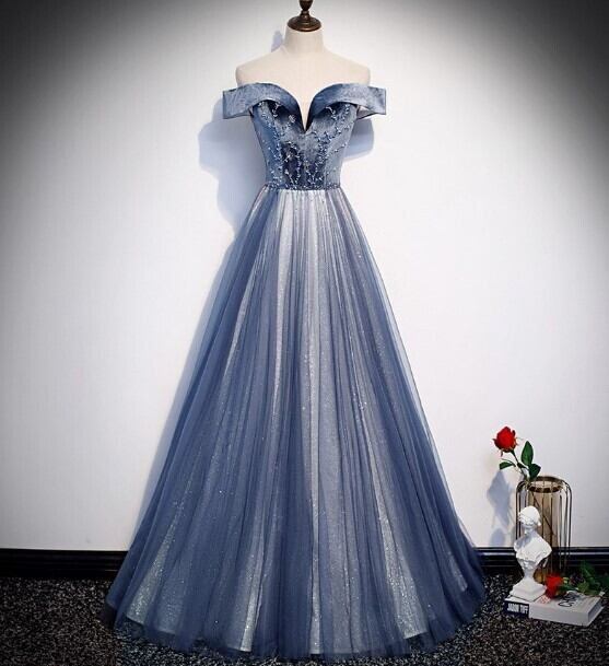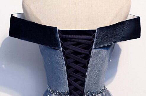 高品質! パーティードレス 青/ブルー オフショルダー ロング エレガント 細見えシルエット