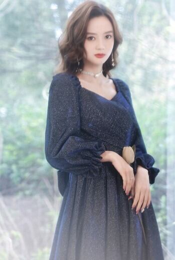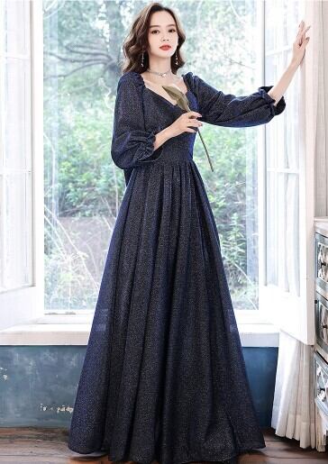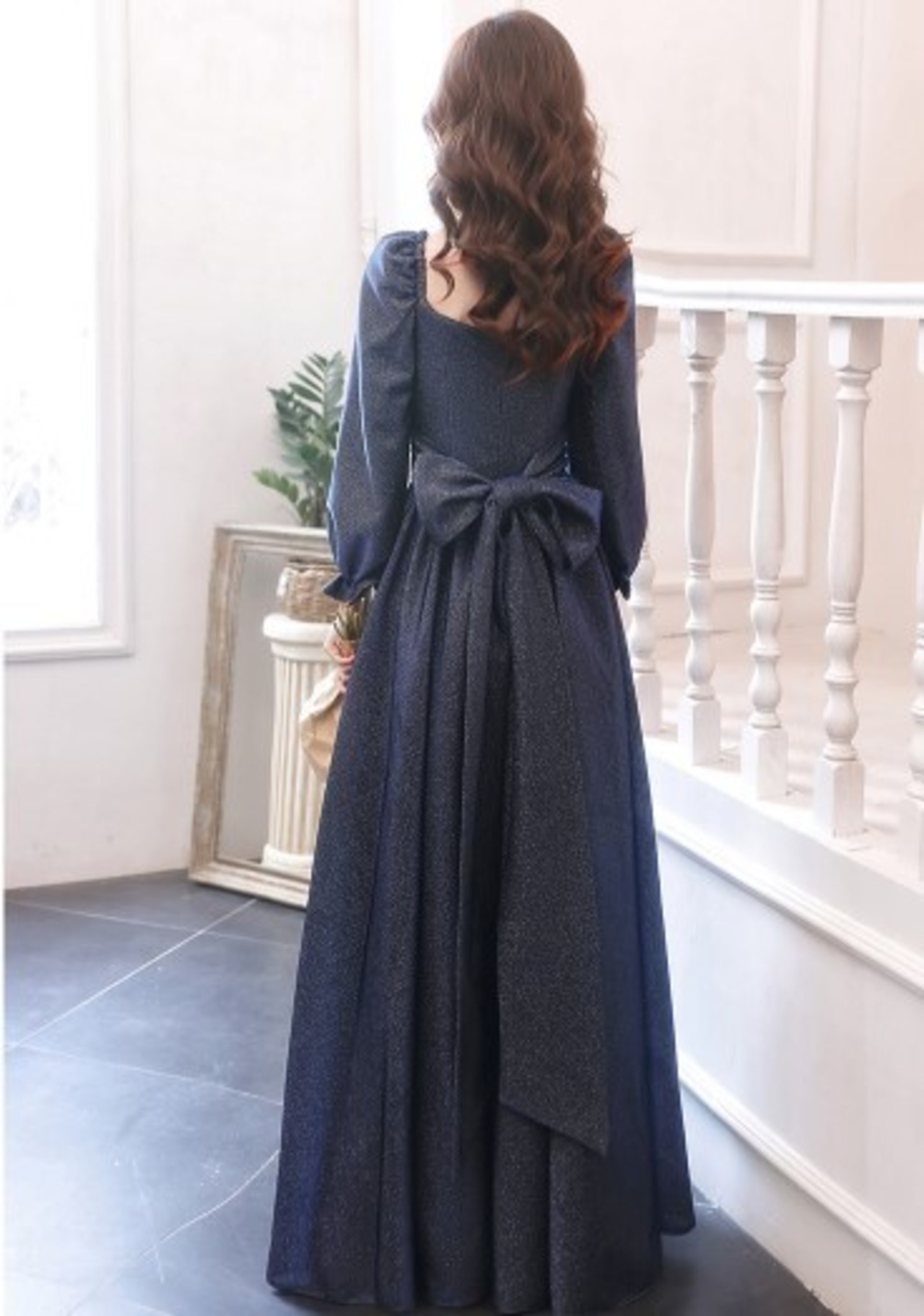 美品! パーティードレス 紺/ネイビー ロング 長袖 エレガント 細見えシルエット