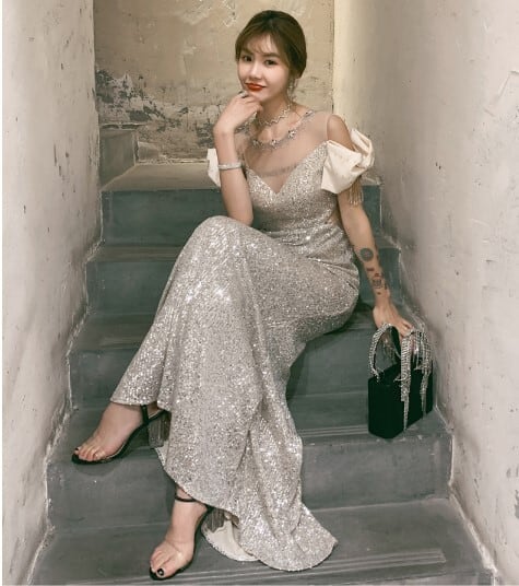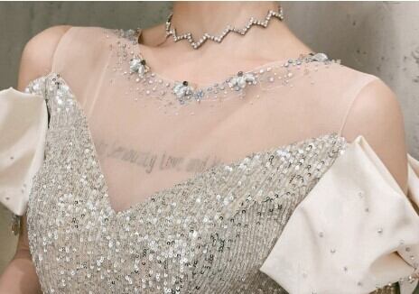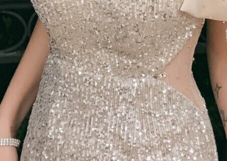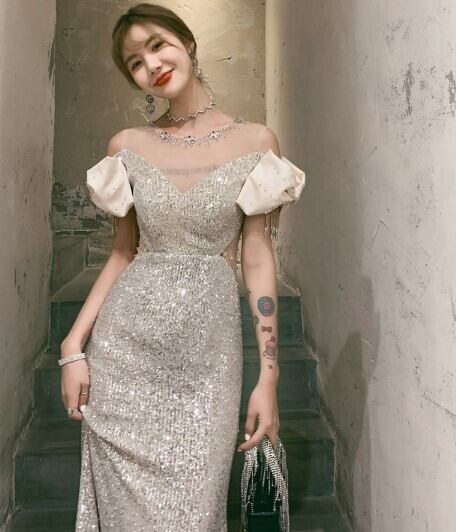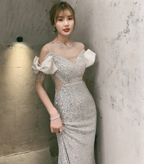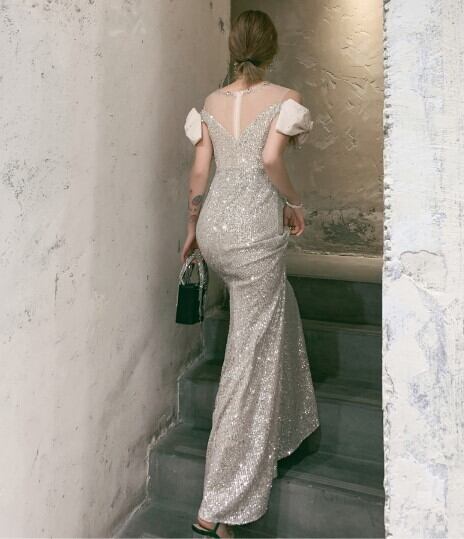 上品! パーティードレス シャンパン色 マーメイドライン スパンコール エレガント 細見えシルエット