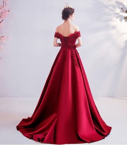 美品! パーティードレス ワインレッド オフショルダー 繊細レース 編み上げ 細見えシルエット