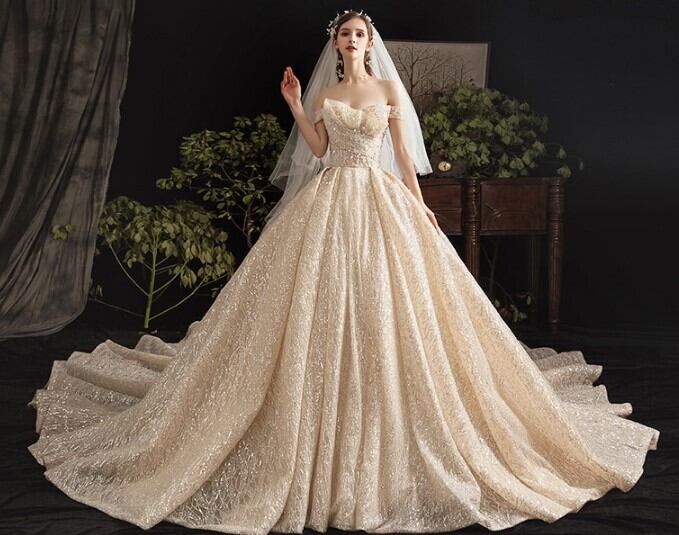 豪華! ウエディングドレス オフショルダー ロングトレーン エレガント 編み上げ 細見えシルエット