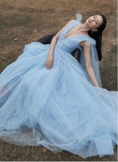上品! パーティードレス ライトブルー 深Vネック プリンセスライン 人気上昇 可愛い 憧れのドレス