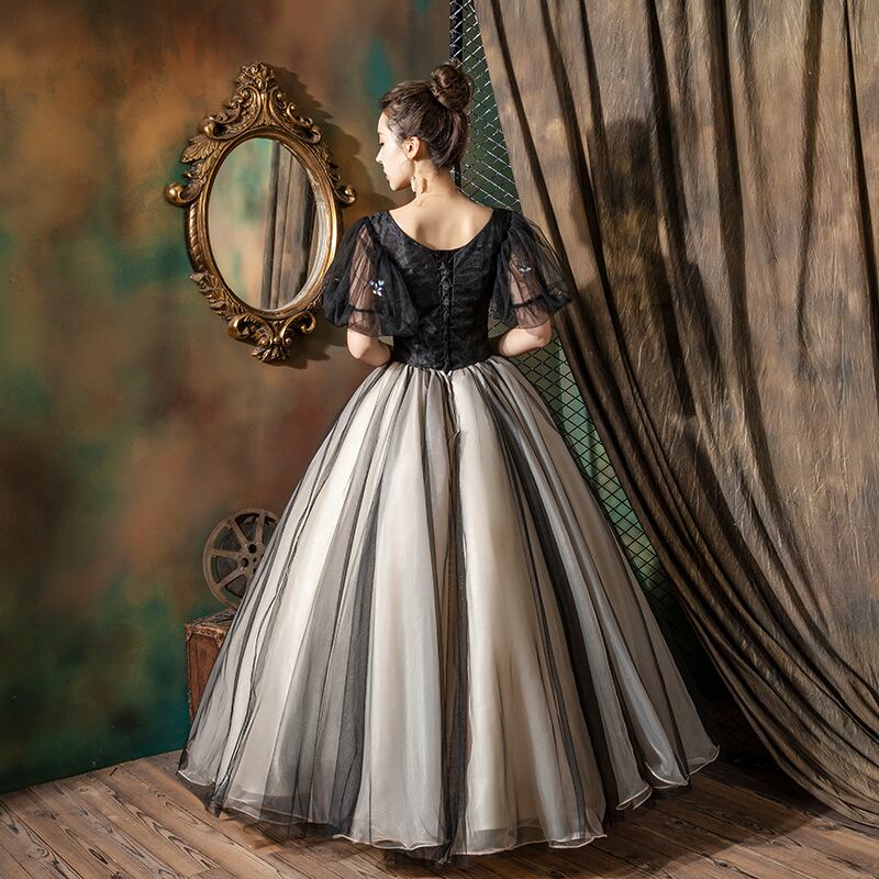 美品! パーティードレス 黒 ソフトチュール 花モチーフ パフスリーブ 人気上昇 フレアスカート 華やか