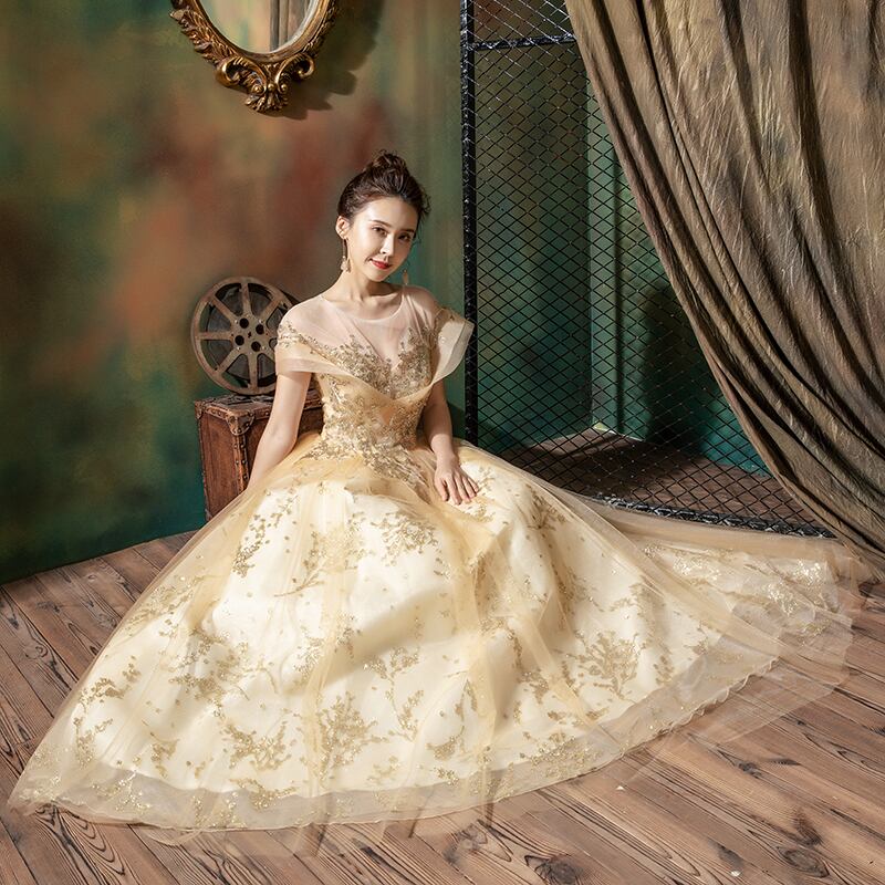 上品! パーティードレス ゴールド キラキラグリッターチュール プリンセスライン 人気上昇 クラシカル 華やか