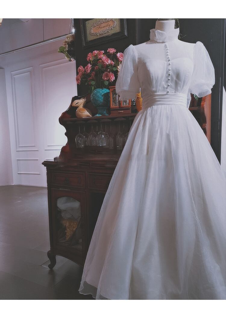 上品!ウエディングドレス ホワイト ソフトチュール プリンセスライン パフスリーブ 華やかなトレーン エレガント 華やか 憧れのドレス