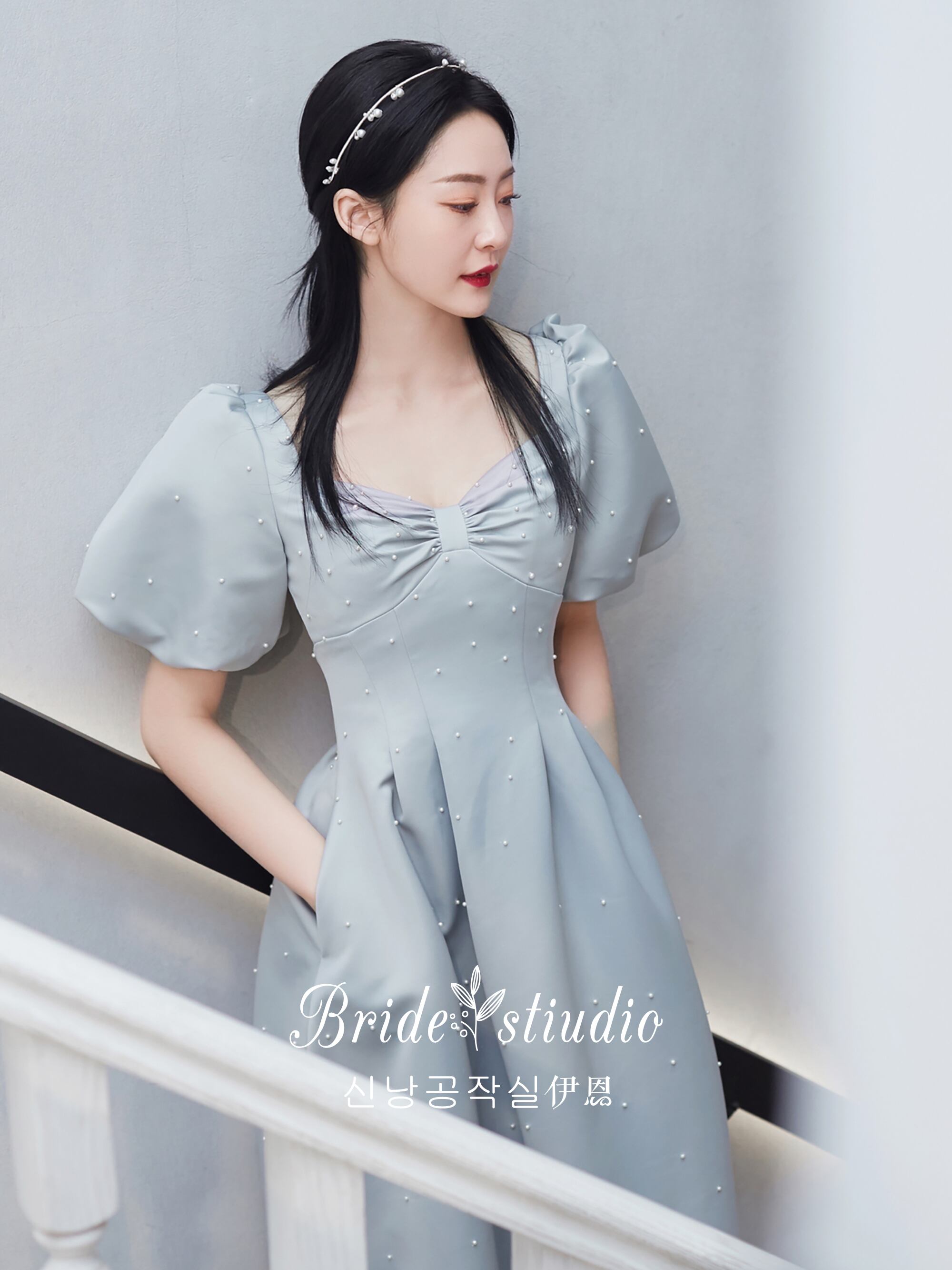 上品!パーティードレス 水色 ボートネック パール パフスリーブ ロングドレス エレガント クラシカル