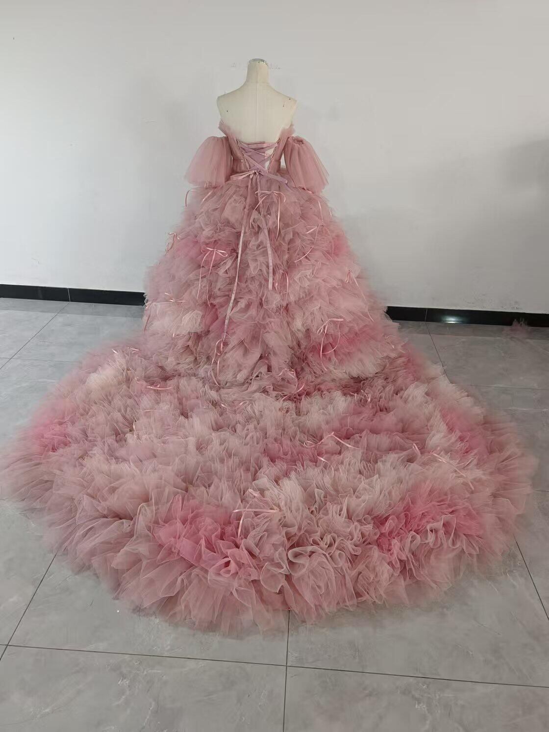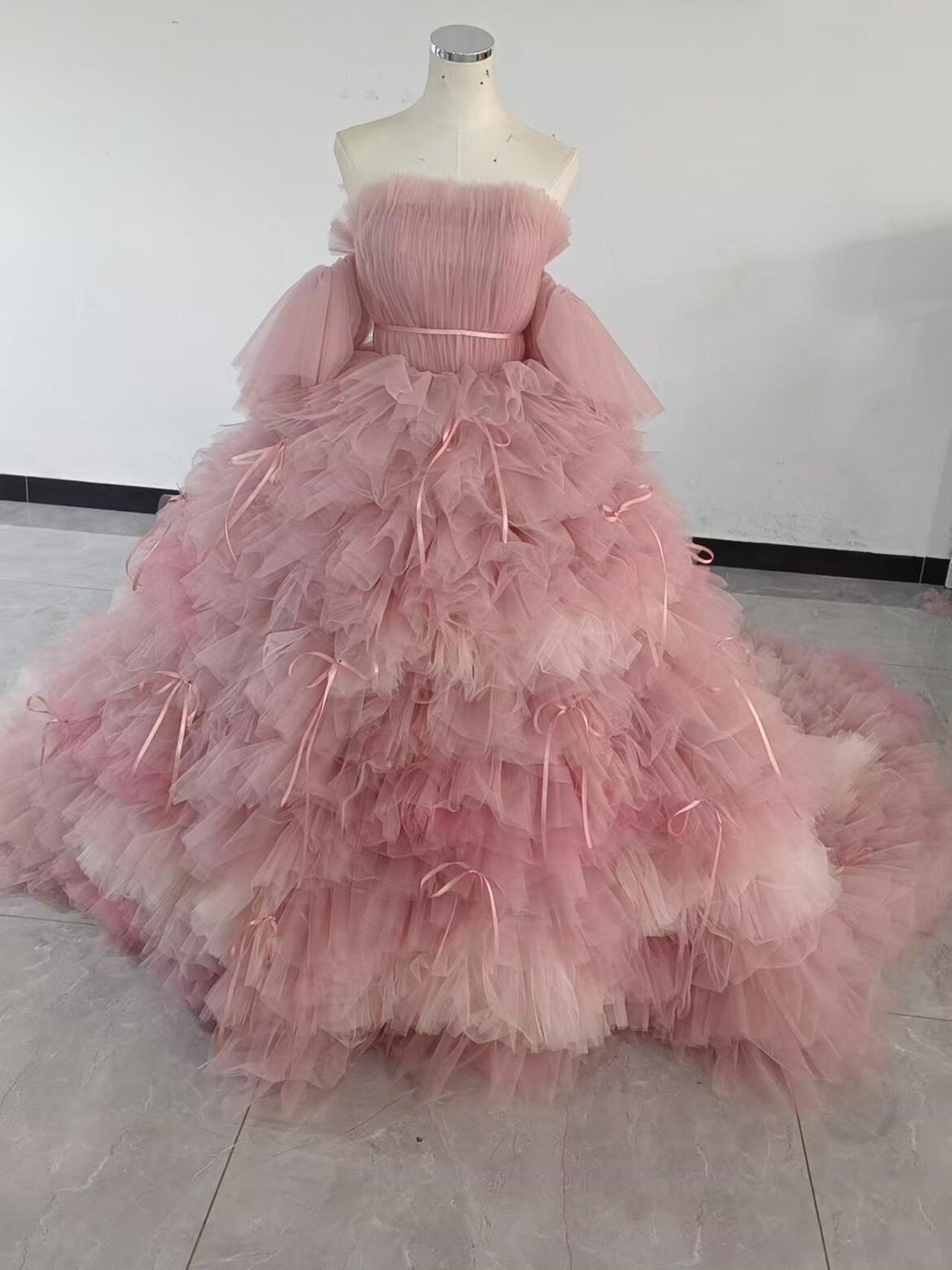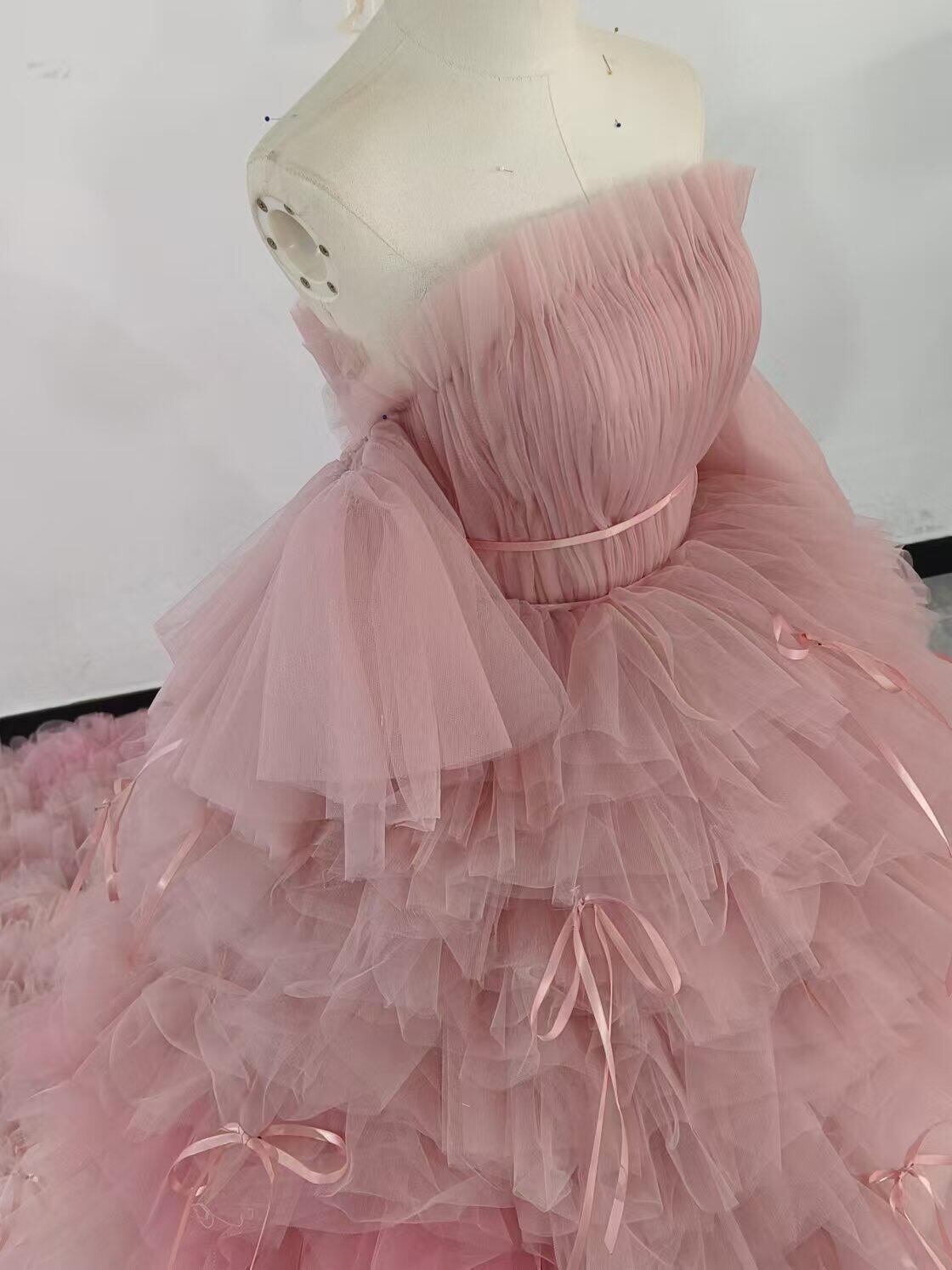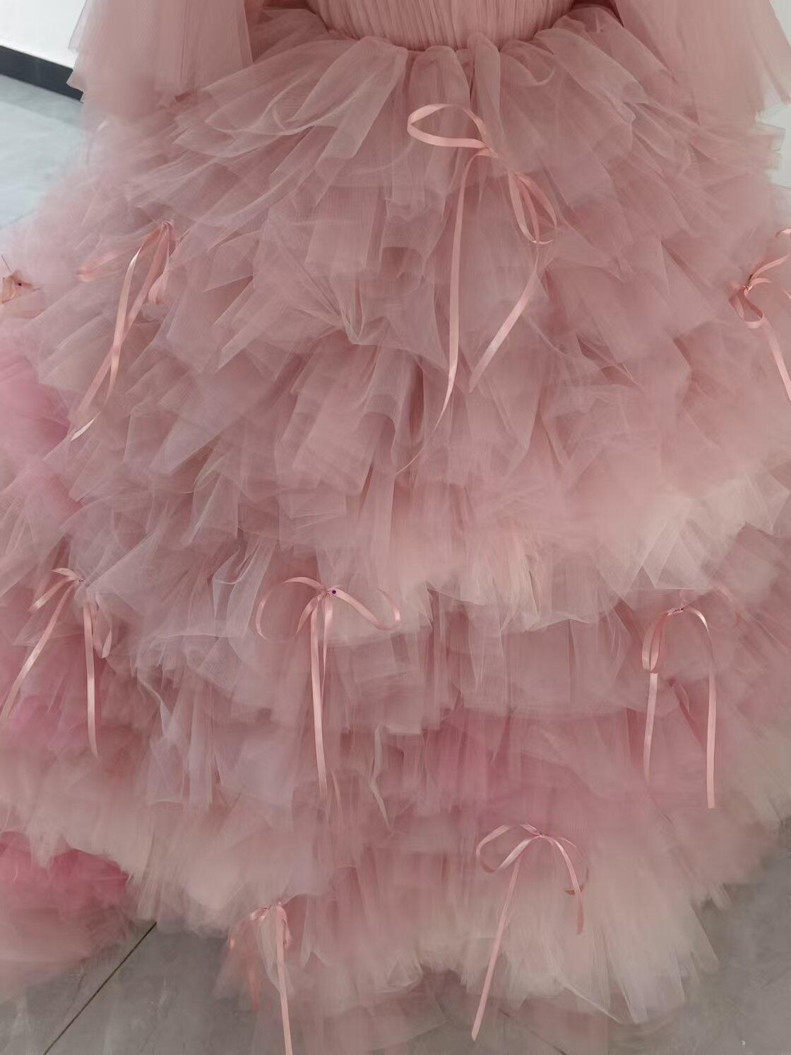 カラードレス ピンク もこもこドレス リボン 編み上げ 披露宴/結婚式 花嫁/ウェディングドレ 可愛い