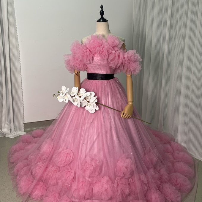 送料無料!カラードレス ビビッドピンク オフショルダー 花モチーフ ふわふわドレス プリンセスライン サッシュベルト 花嫁 結婚式/披露宴