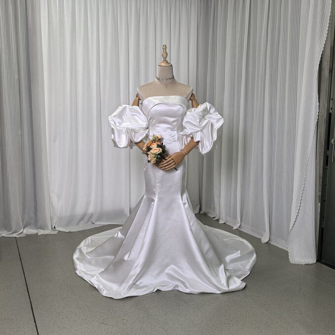 ウェディングドレス パフスリーブ 編み上げ 結婚式 ベアトップ 光沢サテン オフホワイト